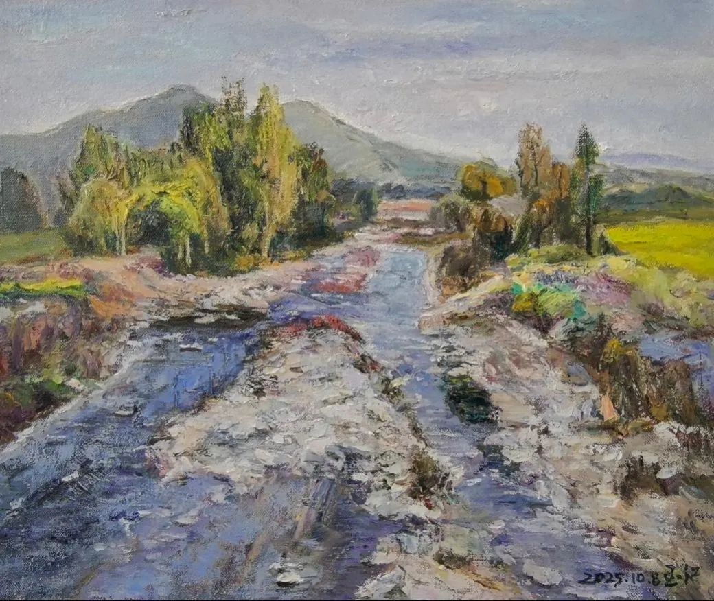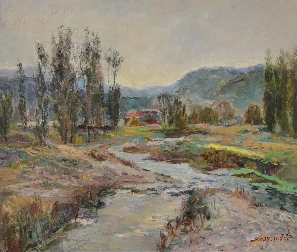 ,主持油画艺术教学至今。他的艺术探询注重风景写生,践行于实处,坚持“写生中创作”基于现实主义审美意识。他画大东北的黑土地、燕山深处古村落、平常的静物,在色彩感受上注重情感的融入,有感于人间冷暖和岁月沉沦的痕迹,显之于笔触。他是上个世纪六十年代初生人,也是八十年代东北师范大学美术系毕业的大学生,他的画有着一代人的共同记忆和审美范式。感伤,且不失担当;朴华,且不显于技巧;凝重,且同频于时代。“笔墨当随时代”(石涛),他的艺术是一代人对于一方山水的真情坦露和端正表述。在他的油画艺术中亦能看到现实主义美术的印迹和近代中国乡土美术的抒怀。他的油画色彩沉郁、厚重,笔触朴华、灵动,显示出画者对于油画语言的高度淬炼和深刻理解,对于欧洲油画传统内在意蕴和审美范式的深入思考。他的艺术表达是真实的,这在艺术当下显得弥足珍贵;亦是朴素的,这正是一位高校教授人文修为的本色呈现。