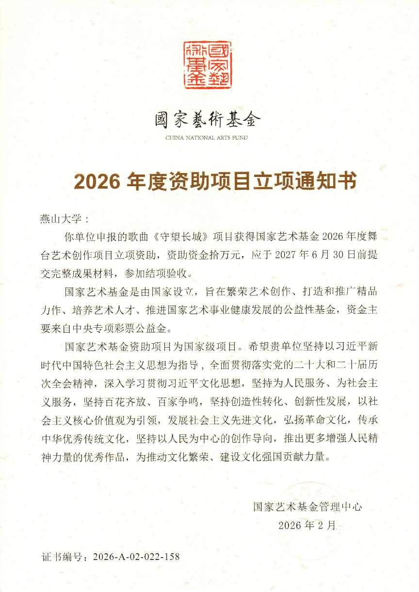 近日,国家艺术基金管理中心公布了国家艺术基金2026年度资助项目立项结果,我院宁岩鹏老师申报的歌曲《守望长城》获批国家艺术基金2026年度舞台艺术创作资助项目。这是我院在高层次艺术创作项目立项方面取得的又一重要成果,充分体现了日本a片