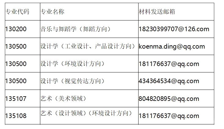 各专业方向考生对应发送材料的邮箱如下: