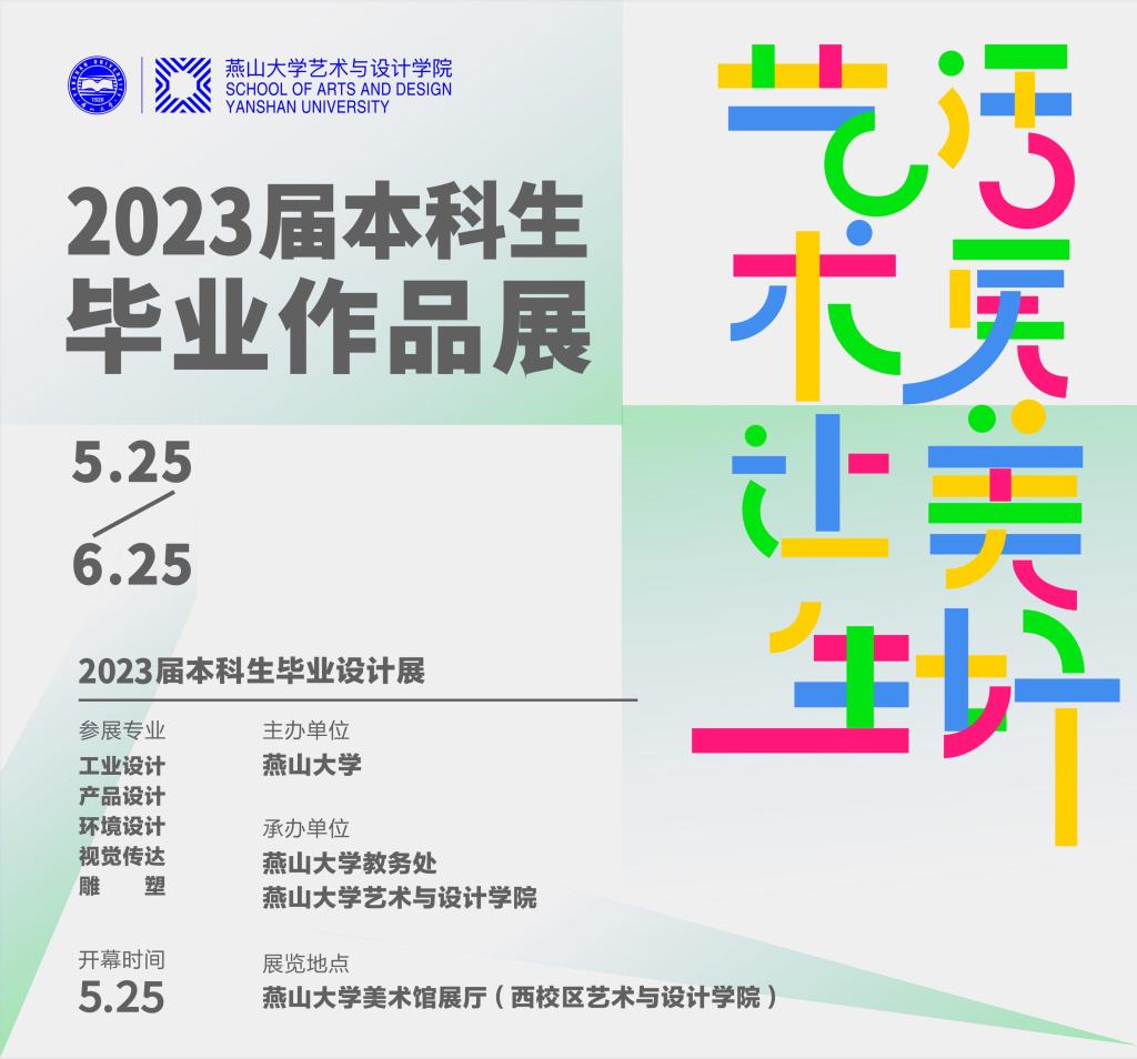 将于2023年5月25日11:20举办“艺术让生活更美好”—2023届本科生毕业作品展开幕式。展览涵盖工业设计、产品设计、环境设计、视觉传达、雕塑五个专业(领域)本科生的毕业设计作品,凝聚了毕业生四年的创新成果和学习结晶,欢迎广大师生前来观展!