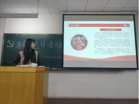 首先胡晔同学带领大家共同欣赏了歌曲《我和我的祖国》和诗词《念奴娇·井冈山》,给在场师生展现出一个青春蓬勃、蓄势待发的中国;随后郭以涵同学带领大家学习了“凉山救火烈士”赵万琨、张浩等同志的先进事迹并播放了学习视频,引起同学们的强烈共鸣;紧接着李明玉同学向大家推荐了《马克思靠谱》一书,该书用通俗易懂、极富感染力的方式,再现了马克思真实的个人形象和魅力,凸显了马克思主义在当下的积极现实意义。