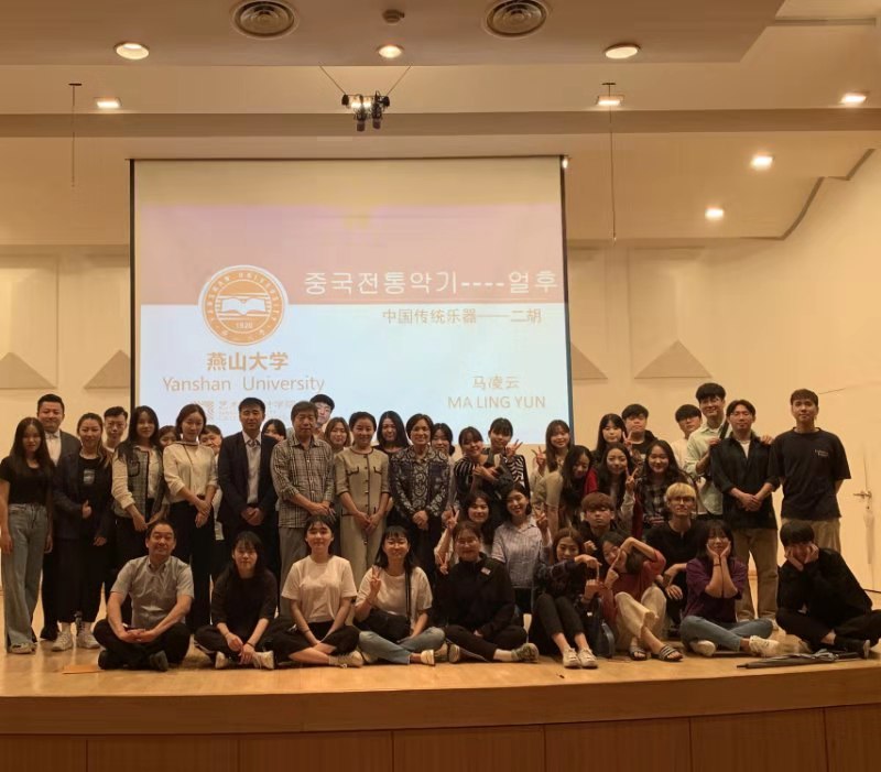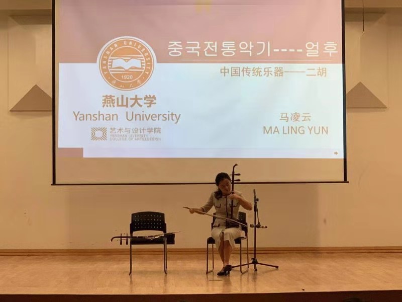 及来韩访学的安排。其次,马老师介绍中国二胡的起源、构造、代表人物及乐曲等,并示范演奏了《二泉映月》、《茉莉花》、《空山鸟语》等代表曲目。由于韩国国乐系的奚琴专业与二胡相似,在最后的提问、互动环节,马老师将奚琴和二胡的异同点做了对比,国乐系的同学们积极互动并上台感受二胡演奏的魅力。