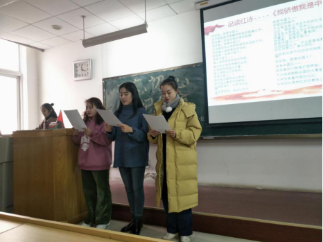 首先桓梦莹等4名同学表演了小合唱《共筑中国梦》,紧接着杨洋等3名同学表演了配乐诗朗诵《我骄傲,我是中国人》,这首诗激情洋溢地列举了中华民族取得的辉煌成就,讴歌了华夏史册的昨天和今天,预示了中华民族的明天更加灿烂辉煌。