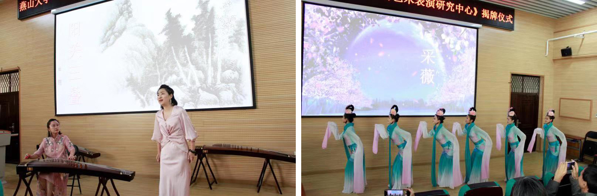 音乐系师生代表进行了国学经典舞台艺术表演,展示了古筝与古诗词艺术歌曲演唱《阳关三叠》、古筝重奏《春江花月夜》、舞蹈与国学经典展示《采薇》三首作品。
