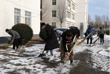 午休刚开始,各个学生党支部就行动起来,对美术馆和音乐馆周边责任区内的积雪进行了清理,同学们不顾天寒路滑,干劲十足,齐心协力,历时1个半小时将教学楼周边主干道和公共停车场区域的积雪清理干净,为校园内道路通畅,车辆、行人安全出行提供了保障。