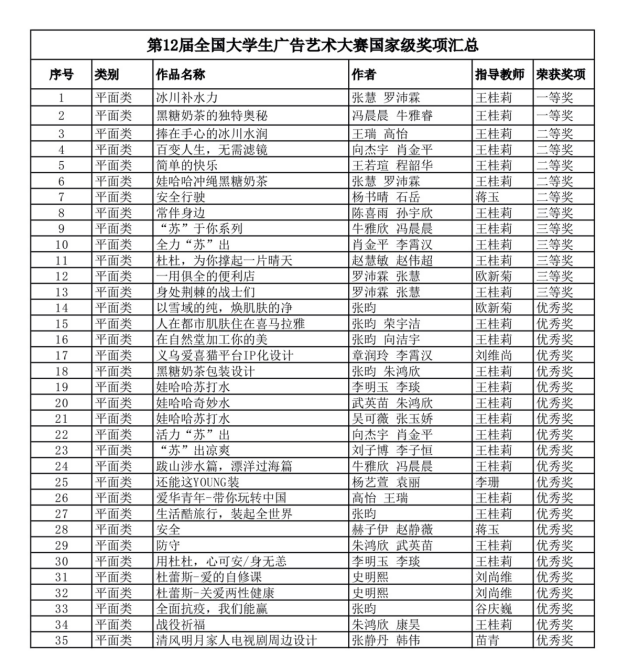 参赛历史最好成绩之一。其中,视觉传达设计系王桂莉老师指导的《冰川补水力》《黑糖奶茶的独特奥秘》获得一等奖,蒋玉、王桂莉、欧新菊等老师指导的作品分别获二、三等奖及优秀奖。