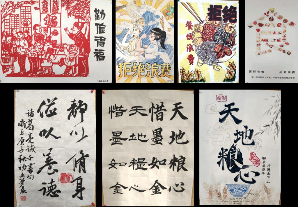 此次作品展以“厉行节约、珍惜粮食”为主题,充分发挥学生的专业优势和专长,共征集创意海报、手绘、书法、剪纸作品等40余幅。展出作品积极向上,通过多层次、立体化的风格宣传了节约新风、文明消费、节约用餐的时代风尚。