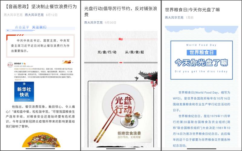 持续开展“天地粮心、惜墨如金”系列宣传活动,利用“燕大风华艺苑”网络平台,已发布3期“世界粮食日|今天你光盘了吗”、“光盘行动|倡导厉行节约,反对铺张浪费”、“【音画思政】坚决制止餐饮浪费行为”专题推文,在日本a片