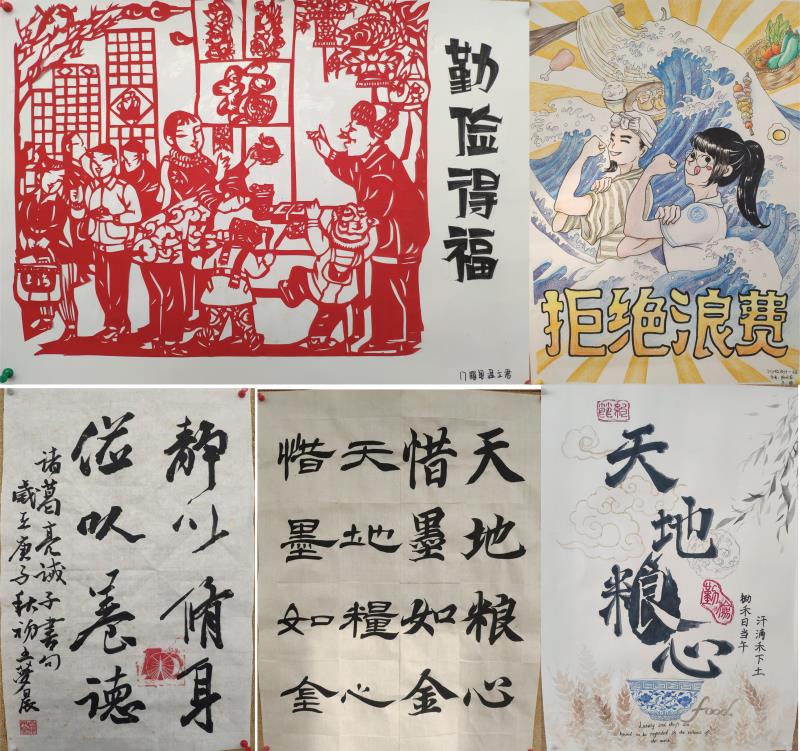 此次作品展以“厉行节约、珍惜粮食”为主题,充分发挥学生的专业优势和专长,共征集创意海报、手绘、书法、剪纸作品等40余幅。展出作品积极向上,通过多层次、立体化的风格宣传了节约新风、文明消费、节约用餐的时代风尚。