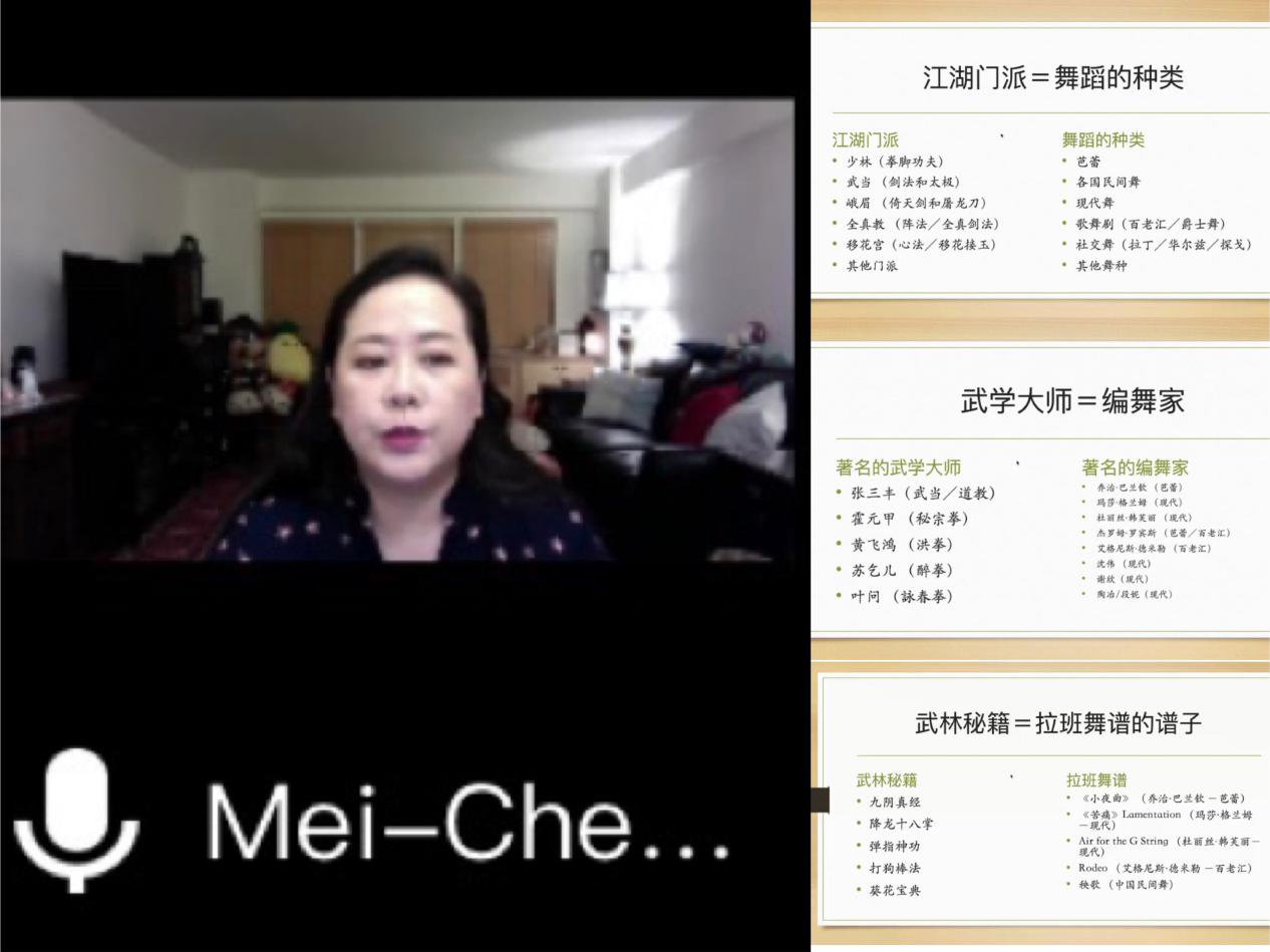 邀请到美国俄亥俄州立大学舞蹈学硕士,美国舞谱局图书馆馆长卢玫蓁教授为舞蹈表演专业全体师生做了题为《从武林秘籍来看拉班舞谱作品的来龙去脉》的云端学术讲座。