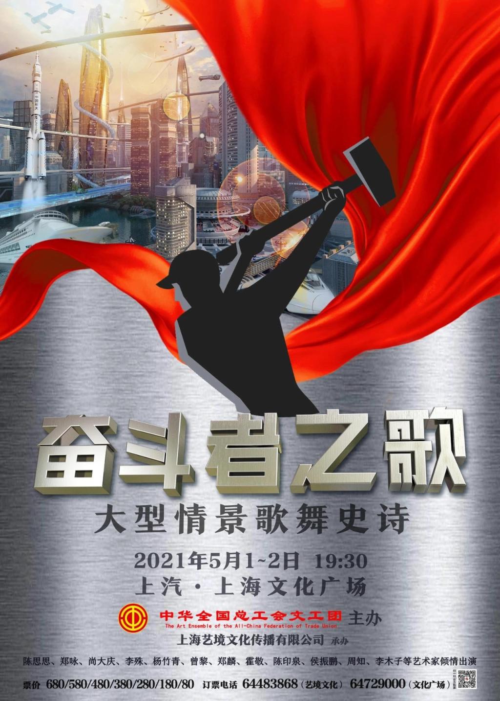 大型情景歌舞史诗《奋斗者之歌》是由中华全国总工会文工团原创的舞台艺术作品,2020年11月在北京保利剧院首演。该作品为全国总工会献礼中国共产党建党百年的一部力作,2021年“五一国际劳动节”正式开启全国巡演活动, 演出首站来到了中国共产党的诞生地——上海。