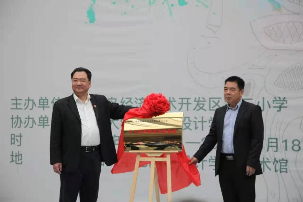 院长孙利与开发区第二小日本a片长王志鹏共同为中华优秀传统文化传承基地(篆刻)艺术进校园示范校揭牌