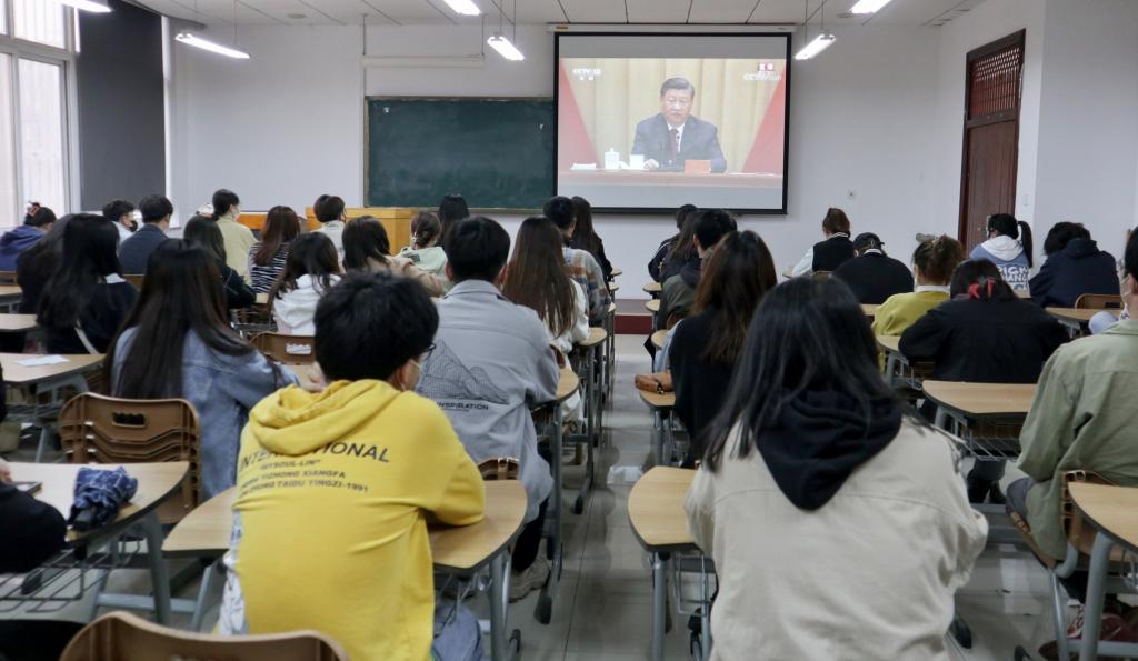 学生组织骨干、优秀团员代表于美术馆A101室集中观看现场直播,各团支部采用云会议形式线上观看。