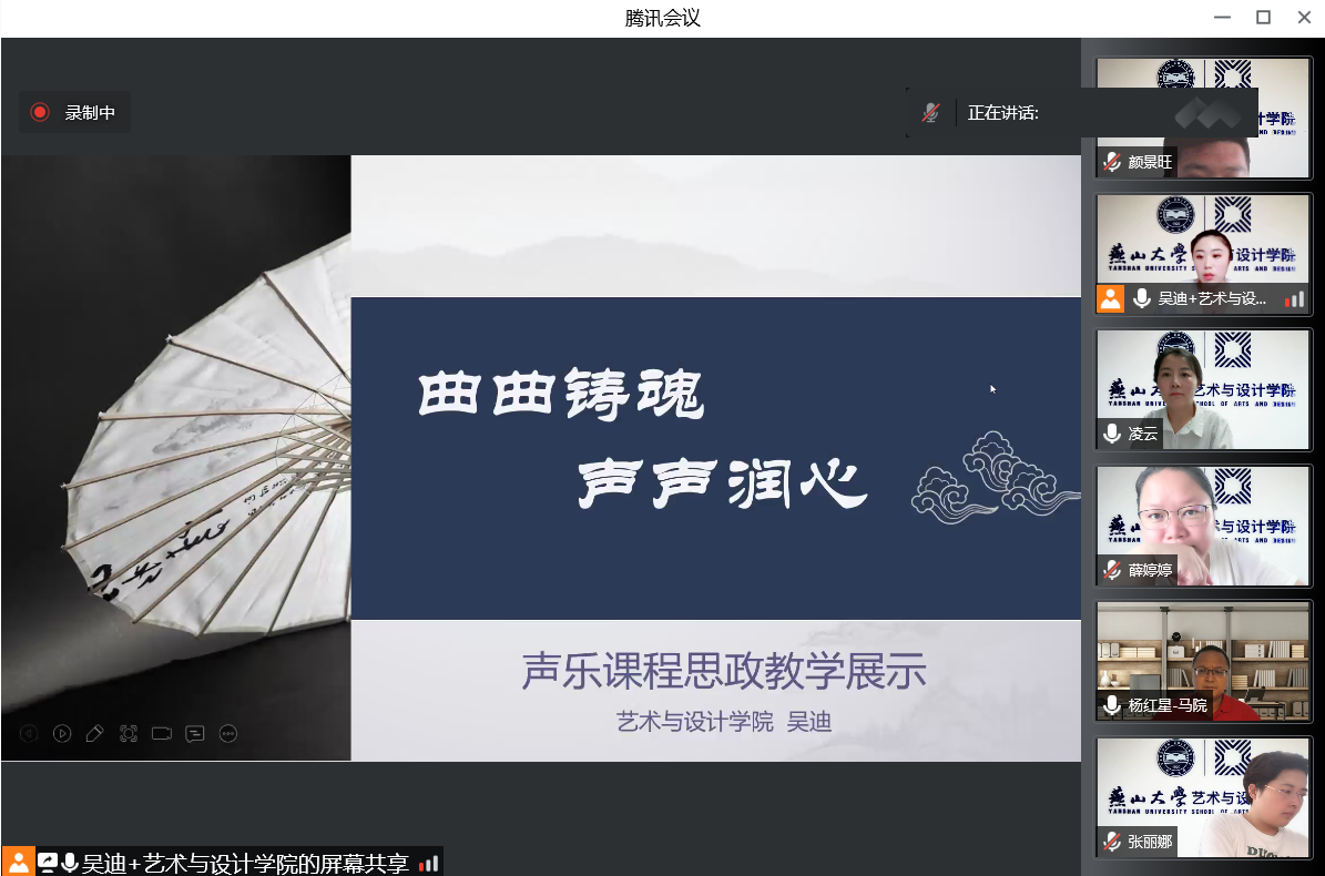 参会教师情况,马凌云老师介绍了音乐系教学概况,音乐系三位教师汇报了《声乐》、《舞蹈作品赏析I》、《中国民族乐器》三门课程的课程思政案例。
